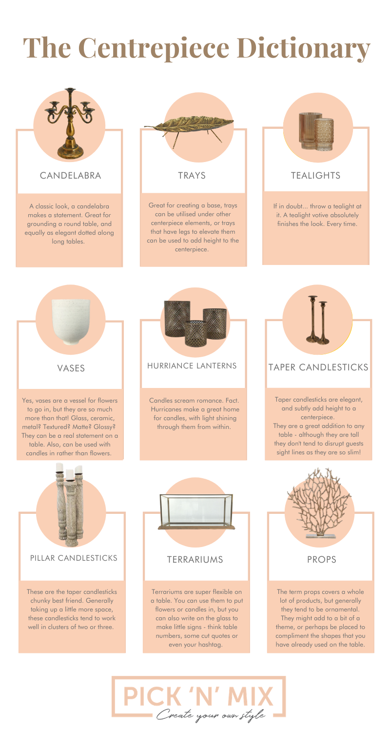Designing a centrepiece from scratch is hard and many of us don’t know where to begin. Our Styling Director has broken down the lingo and described how each element can best be used. Have more questions? No problem. Get in touch here or comment below & send your questions through - we’re here to help, no strings attached.
